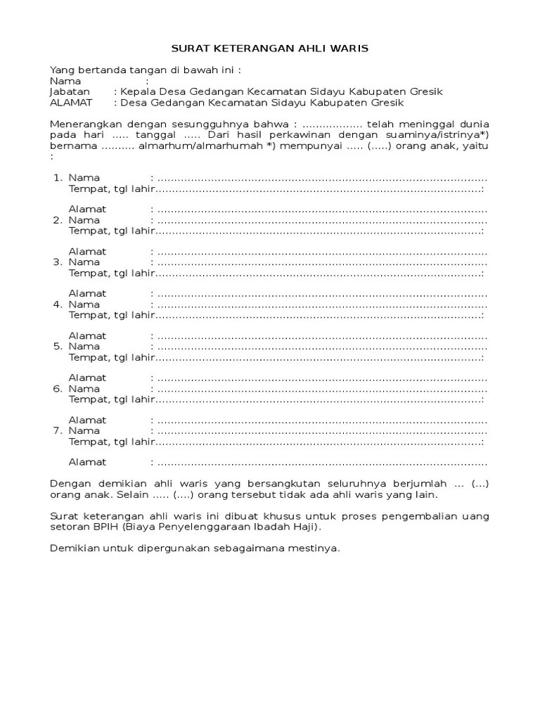 Surat keterangan ahli waris merupakan surat keterangan yang isinya adalah pernyataan bahwa pihak pembuat surat keterangan ahli waris tersebut memang benar benar berhak atas segala sesuatu yang diwariskan oleh seseorang. 15 contoh surat keterangan ahli waris yang resmi dan sah. Contoh surat keterangan kesepakatan para ahli waris atas pembagian harta warisan dari harta yang meninggalkan (ayah). Surat keterangan ahli waris ini dibuat khusus untuk proses pengembalian uang setoran bpih (biaya penyelenggaraan ibadah haji). Contoh surat pernyataan ahli waris jual beli tanah. Sebelum membuat surat kuasa, ada baiknya ketahui contoh surat kuasa yang baik dan benar terlebih dahulu. Surat kuasa ahli waris merupakan pelimpahan hak, tanggung jawab dan tugas kepada pihak lain untuk mengurus warisan dari ahli waris dilakukan dengan pembuatan surat kuasa ahli waris. 15 contoh surat keterangan ahli waris yang resmi dan sah. Contoh surat kuasa ahli waris haji involve some pictures that related one another. Surat keterangan ini sekilas hampir mirip dengan surat pernyataan, namun sejatinya ke dua surat tersebut adalah surat yang berbeda. Zaenal fitrah arifin yang berupa sebidang tanah seluas 1000 m2 dengan alamat di. Contoh surat kuasa ahli waris surat kuasa ahli waris contohpedi contoh surat kuasa ahli waris menjual tanah atau rumah diperlukan untuk m. Contoh surat kuasa ahli waris pembatalan haji picture placed ang submitted by admin that kept in our collection.